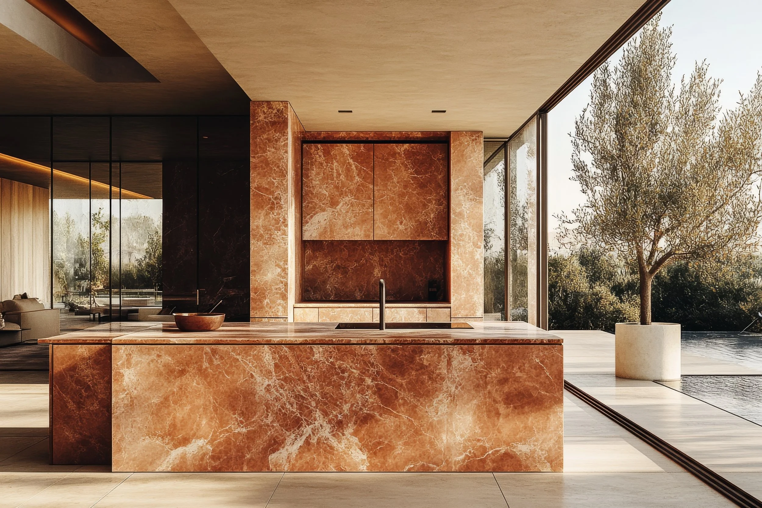Due to its naturally porous composition, travertine requires regular sealing to prevent staining and moisture absorption. For a smoother, more refined appearance, honed or filled travertine features its characteristic voids expertly filled. Though visually striking, travertine may not be the most practical choice for high-traffic kitchens, as it is prone to etching when exposed to acidic substances such as lemon juice or red wine.